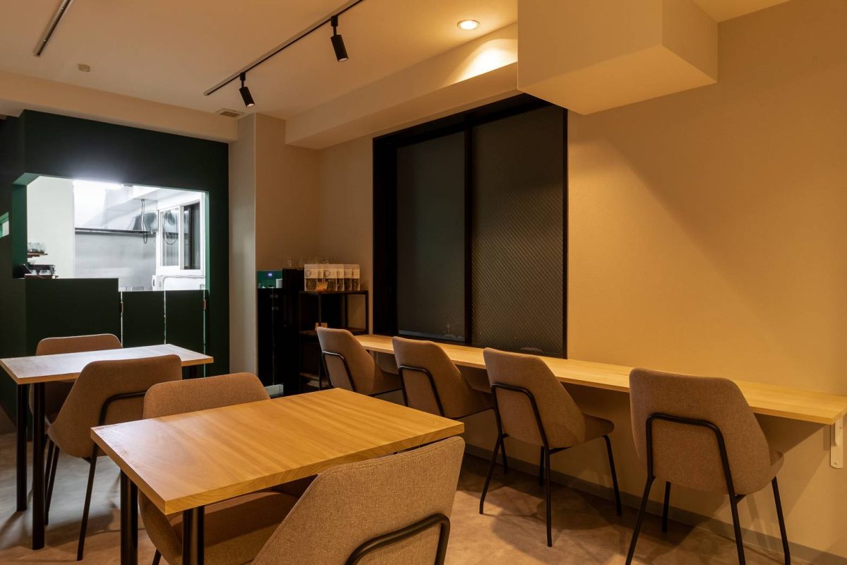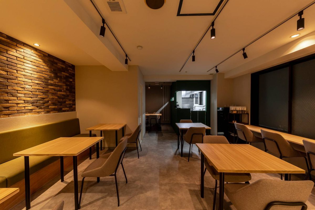 奥の厨房の壁色も外壁と合わせ、グリーン色での塗装で仕上げ、空間のアクセントとなっている。 奥の厨房の壁色も外壁と合わせ、グリーン色での塗装で仕上げ、空間のアクセントとなっている。