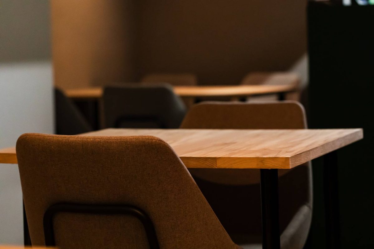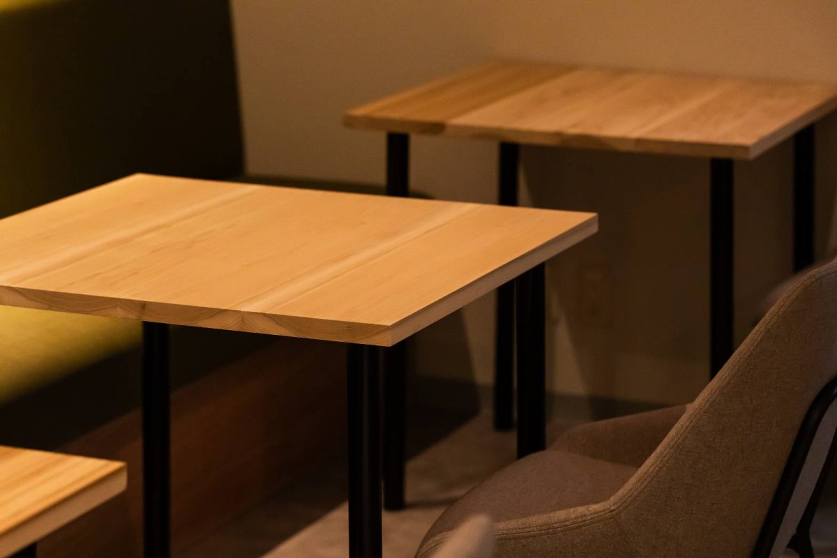 造作のテーブルは、大きさ・高さを統一することで、状況に応じて自由に連結して使用可能となっている。 造作のテーブルは、大きさ・高さを統一することで、状況に応じて自由に連結して使用可能となっている。